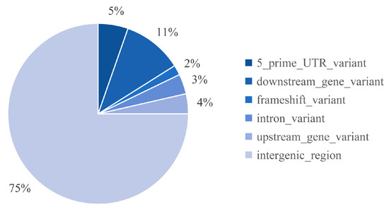 The distribution of SBSs and InDels in the sorghum chromosomes is shown in Figure 4. SBSs in each mutant affected all chromosomal segments. However, there were substantially more SBSs and InDels in some chromosomes than in others. For example, chromosome 4 had 42% and 38% of all SBSs and InDels (Figure 4a,b). Large-fragment deletions and duplications occurred more frequently in chromosome 2 and chromosome 3 (Figure 4c). The variants were divided into distinct categories according to their genomic locations. We found that the frequencies of SBSs in the genic regions were less than 3% in all mutant groups, significantly lower than in the intergenic regions (approximately 98%–100%) (Figure S2a). The frequencies of InDels in the genic regions were also lower than in the intergenic regions, ranging from 5% to 25%, with the highest frequency in the 19 Gy-treated lines (Figure S2b). Forty-two of the observed InDels in the 19 Gy-treated lines were located in intergenic regions, eight in downstream and upstream regions of genes, and six within untranslated regions (UTRs), with one change inducing a frameshift (Figure 5).