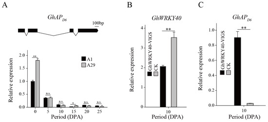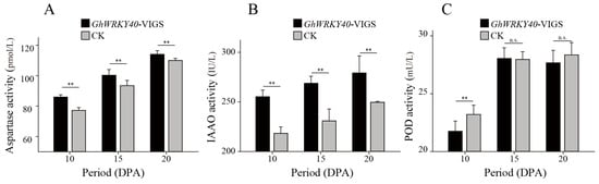 Zhang, S.; Cai, X.; Wei, J.; Wang, H.; Liu, C.; Li, X.; Tang, L.; Zhou, X.; Zhang, J. GhWRKY40 Interacts with an Asparaginase GhAPD6 Involved in Fiber Development in Upland Cotton (Gossypium hirsutum L.). Genes 2024, 15, 979. https://doi.org/10.3390/genes15080979