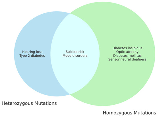 Although heterozygous carriers do not exhibit any symptoms, they are at significant risk of developing a spectrum of psychiatric symptoms associated with the WFS1 mutations [10,76,77]. Numerous studies have established a link between heterozygous WFS1 variants and deafness, as well as an increased risk of developing type 2 DM [78]. WFS1 heterozygosity has also been associated with metabolic diseases, psychiatric disorders, and even suicidal ideation [79]. Swift et al. found that 10 of 11 hospitalized relatives of WS1 patients were heterozygotes for WFS1 mutations. These findings revealed that WFS1 heterozygotes had a 26-fold increased incidence of psychiatric hospitalization compared to non-heterozygotes [80].