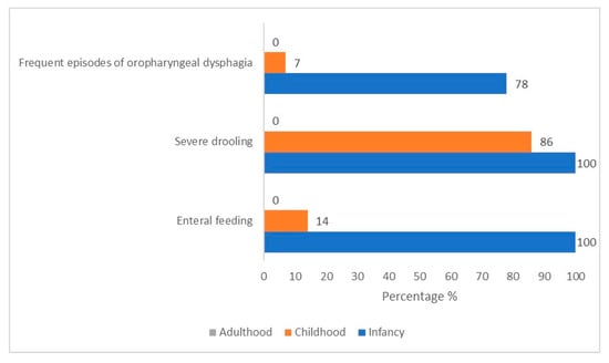 Specifically, all our patients presented severe feeding disorders at birth, caused by scarce sucking, poor sucking–deglutition coordination, severe drooling, and facial muscle contractions. At that time, gavage feeding was necessary in order to meet the adequate nutritional intake.