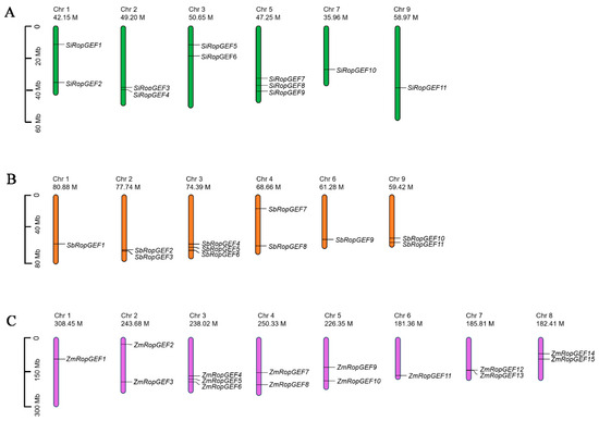 Chromosome distribution of the 37 RopGEF genes. Chromosome location map drawn with the Mapchart software. The scale is in megabases (Mb). (A) The distribution of 11 SiRopGEF genes on chromosomes. (B) The distribution of 11 SbRopGEF genes on chromosomes. (C) The distribution of 15 ZmRopGEF genes on chromosomes.