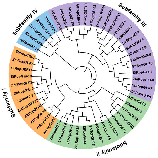 Phylogenetic analysis of RopGEF family members from millet, sorghum, maize, and Arabidopsis. The phylogenetic tree was created using complete protein sequences and the neighbor-joining (NJ) method. Various color shades were employed to differentiate between different Clades, while Subfamilies I–IV were used to classify the RopGEF family members.