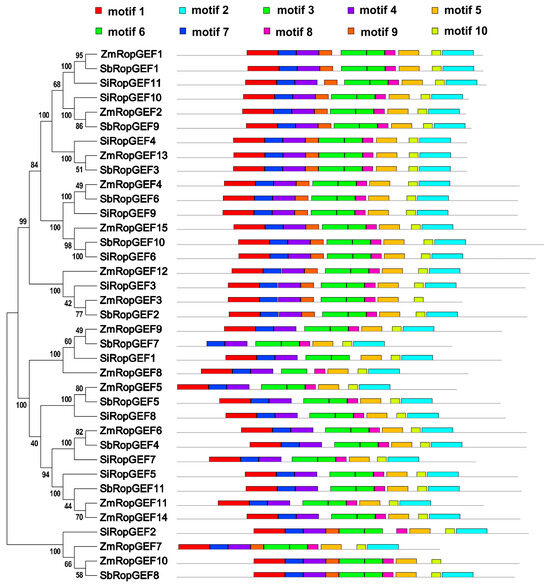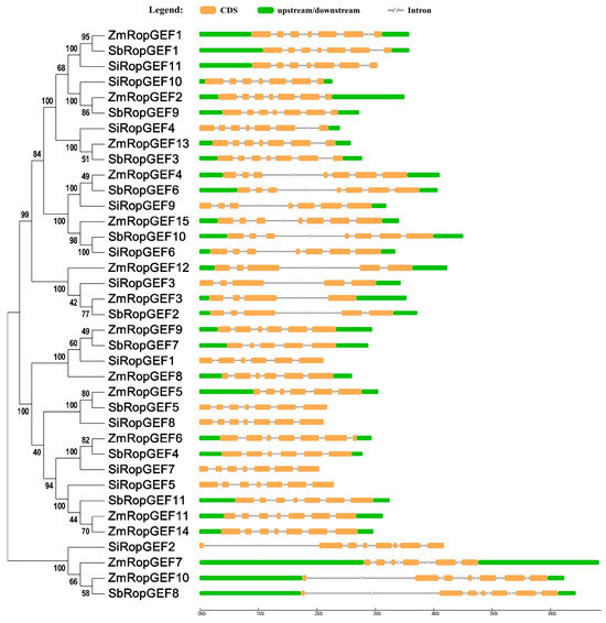 A total of 37 RopGEF members were identified in the genomes of millet, sorghum, and maize. Subsequently, they were reclassified based on their chromosomal distribution and grouped into four subfamilies according to their phylogenetic relationships. Upon analyzing the structural characteristics of the RopGEF family members, it was noted that each subfamily exhibits similar structural features, including motif composition and conserved intron–exon distribution. The variations in the expression patterns of RopGEF members suggest their potential roles in plant growth and development, response to abiotic stress, and hormone signal transduction. These findings indicate that the RopGEF gene could serve as a valuable genetic marker for facilitating future research aimed at elucidating the functional traits of RopGEFs.