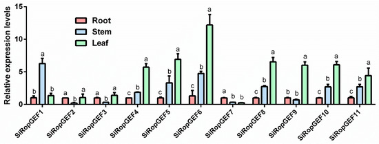 Tissue-specific expression pattern of SiRopGEFs. At the seedling stage (28 days), the millet plants were harvested to collect the roots, stems, and leaves for tissue-specific expression analysis of SiRopGEF family genes using qRT-PCR. The samples were immediately frozen in liquid nitrogen and stored at −80 °C for further analysis. The x-axis represents the different genes from various tissues while the y-axis displays the relative expression levels of each gene compared to the controls at the roots. The error bars indicate the standard deviations of the three independent biological replicates. Lowercase letters (a–c) denote significant differences (p < 0.05).