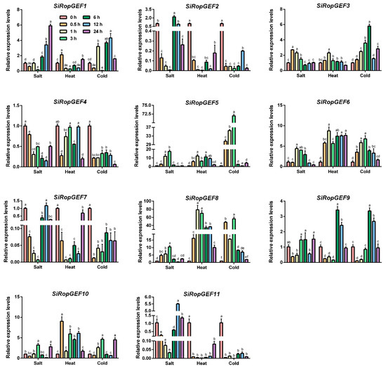 Transcriptional expression profiles of the SiRopGEFs when responding to abiotic stresses. Gene expression analysis was conducted using qRT-PCR to assess the impact of salt (200 mM NaCl), heat (40 °C), and cold (4 °C) stresses. Plants that were 4 weeks old were subjected to these stress conditions. The treatments are displayed on the x-axis, while the relative expression levels of the genes under each treatment compared to the controls (0 h) are shown on the y-axis. Error bars represent the standard deviations of three independent biological replicates. Significance levels (p < 0.05) are denoted by small letters (a–f).