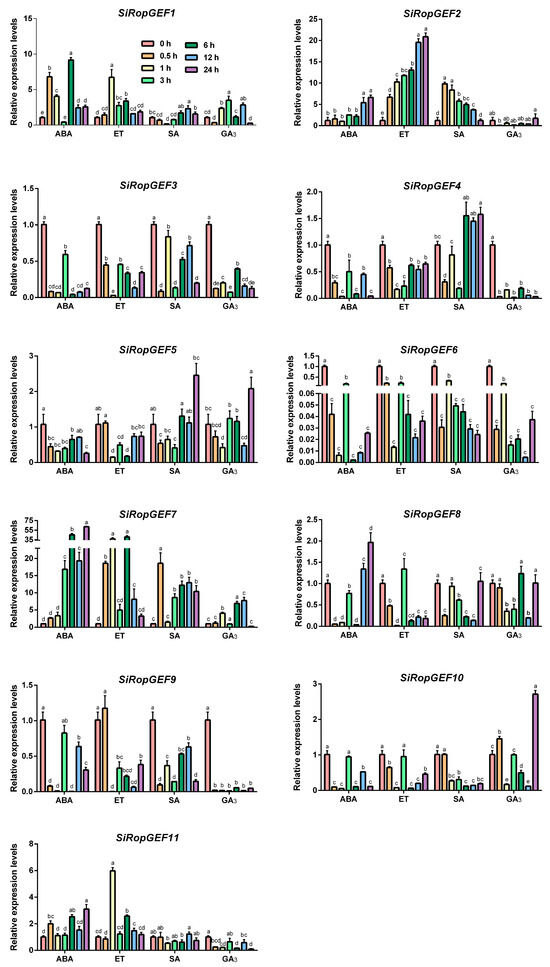 Additionally, we conducted tests on the transcription levels of 11 SiRopGEFs after exogenous application of phytohormone ABA, ET, SA, and GA3 (Figure 7). SiRopGEF2 and SiRopGEF7 exhibited a continuous increase in transcription levels following the application of ABA, with SiRopGEF7 showing a rapid increase at the 6 h time point. On the other hand, SiRopGEF3, SiRopGEF4, SiRopGEF8, SiRopGEF9, and SiRopGEF10 experienced a sharp decrease in transcription levels after 0.5 h of ABA treatment, followed by fluctuations. The application of ET significantly upregulated the expression levels of SiRopGEF2 at all the test time points. However, SiRopGEF3, SiRopGEF4, SiRopGEF6, SiRopGEF8, and SiRopGEF10 saw a sharp decrease in expression levels after 1 h of exogenous ET application, followed by fluctuating transcription levels. When SA and GA3 were applied, the majority of SiRopGEFs showed decreased expression levels that slowly recovered. SiRopGEF9, in particular, maintained a low transcription level after GA3 treatment. These findings suggest that the members of the SiRopGEF family may play a role in hormone signaling pathways.