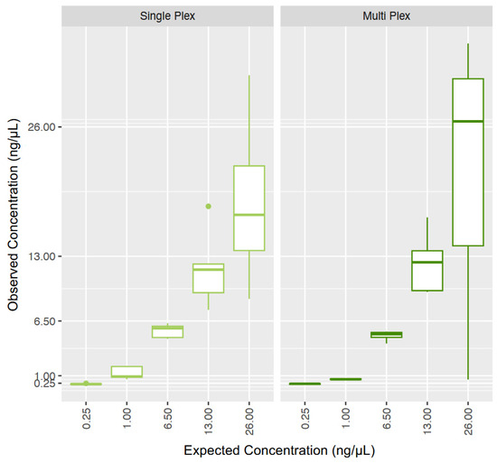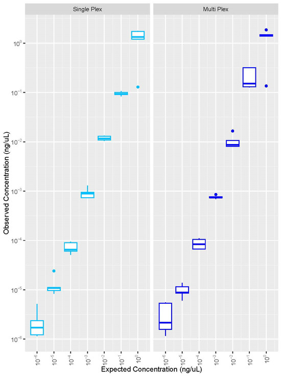 Expected and observed concentrations for the universal bacterial DNA reproducibility study (n = 5). The left panel presents the data from the custom bacterial single-plex, while the right panel represents the data for the bacterial component of the multiplex assay. Note: A log10 scale was used for the y-axis. The middle bar represents the median.