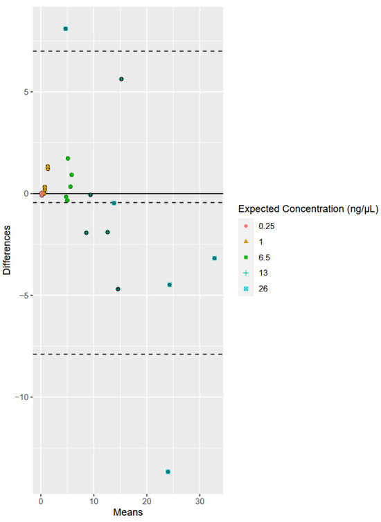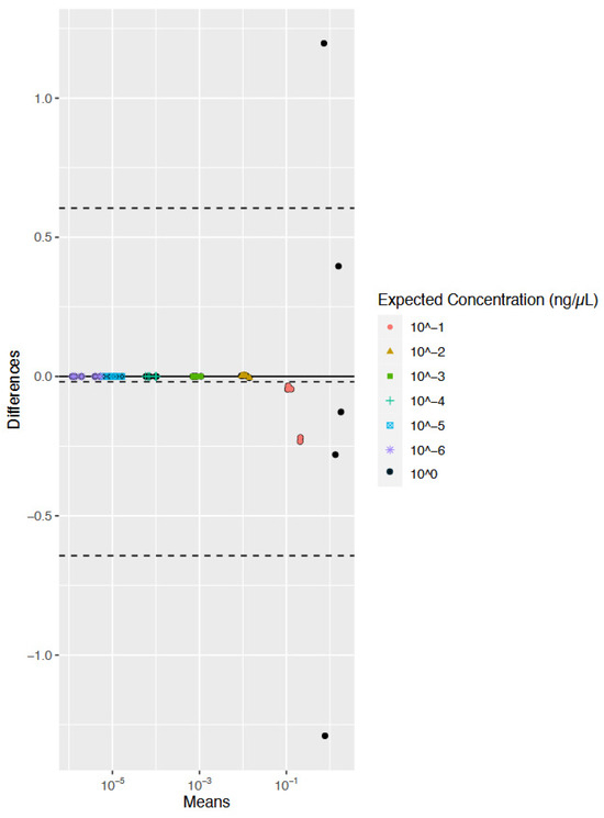 Even though the sample size for the reproducibility study was small (n = 5 for each expected concentration), a preliminary statistical evaluation of the agreement between the single-plex and multiplex was conducted for both the human and the bacterial qPCR assays. Bland–Altman plots show the comparison of two methods of measurement to determine if the methods are interchangeable [39]. More specifically, the Bland–Altman method [38] was used to assess and visualize the degree of agreement between each of the two measurement methods and identify any systematic bias. Data are plotted on the X- and Y-axis, with X representing the mean of the two measurements and Y representing the difference between the two measurements. For example, for the bacterial data (Figure 3), an observation of the sample expected to have a concentration of 1 ng/μL as measured by the bacterial single-plex assay was compared to an observation of the same sample quantified with the multiplex assay. The difference and mean of these data points were calculated and plotted on the graph. The range of the limits of agreement (LoA) is an indication of interchangeability of the two assays. The LoA dictates the bounds of the data based on +/−1.96 S.D. from the average of the data. Bland and Altman suggest that 95% of the data should fall between these bounds [38]. Interpretation of the graph requires the determination of acceptable a priori considerations.