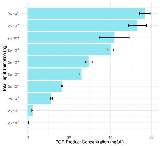 The average PCR product concentrations (ng/μL) for the 20 (56.8 ± 3.7), 2 (53.1 ± 6.2), 0.2 (42.0 ± 10.3), 2 × 10−2 (40.1 ± 2.3), 2 × 10−3 (29.6 ± 2.3), 2 × 10−4 (26.1 ± 1.1), 2 × 10−5 (16.7 ± 0.3), 2 × 10−6 (11.5 ± 0.7), and 2 × 10−7 (2.31 ± 0.4) ng input templates surpassed the necessary amount to allow for a 1 ng input for subsequent bacterial DNA sequencing (Figure 5). The 2 × 10−8 ng input template amount produced an average of 0.251 ± 0.1 ng/μL of PCR product. According to the manufacturer’s protocol for the Nextera XT DNA Library Preparation Kit (Illumina; San Diego, CA, USA), 5 μL of DNA can be used [40]. Therefore, concentrations of bacterial DNA of at least 1 × 10−8 ng/μL will be sufficient for bacterial DNA analysis. These quantification results demonstrated that bacterial DNA quantities down to 10−8 ng/μL can successfully generate PCR products in quantities sufficient for subsequent sequence analysis. Further work should be performed to evaluate the limit of sensitivity for the amplification of bacterial DNA below template input amounts of 2 × 10−8 ng. For samples lacking enough bacterial DNA, a nested PCR approach could be attempted to produce PCR product sufficient for sequence analysis. In addition, this assumes that a visible PCR product on a TapeStation result indicates the potential for a sample to be sequenced. Knowing the range of input bacterial DNA that can be amplified and consequently sequenced will allow scientists to make better decisions regarding whether human or bacterial DNA analysis methods can be pursued during forensic or other investigations.