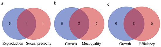 Venn diagram displaying the unique and shared prioritized genes between trait groups and their respective subgroups. Groups and subgroups are (a) reproduction and sexual precocity; (b) carcass and meat quality; and (c) growth and efficiency. No prioritized genes were found for the morphological traits.