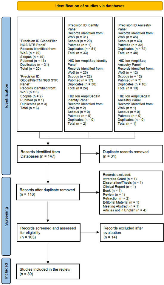The articles presented in this review were selected following the PRISMA guidelines [34]. The search engines used were Web of Science (WoS), Scopus, and PubMed. The following search terms were used: ‘Precision ID GlobalFiler NGS STR Panel’, ‘Precision ID GlobalFilerTM NGS STR Panel’, ‘Precision ID Identity Panel’, ‘HID Ion AmpliSeq Identity Panel’, ‘HID Ion AmpliSeqTM Identity Panel’, ‘Precision ID Ancestry Panel’, ‘HID Ion AmpliSeq Ancestry Panel’, and ‘HID Ion AmpliSeqTM Ancestry Panel’. The search terms were queried by ‘Topic’ from ‘All Databases’ for WoS, which searches title, abstract and indexing, by ‘Article title, Abstract, Keywords’ for Scopus, and by ‘All Fields’ for PubMed. To obtain all the relevant literature produced until the review date (May 2024), no date restrictions were applied.