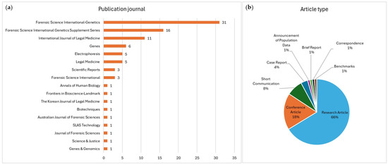 Overall, more than half the articles were published in Forensic Science International: the Genetics (35%) and Supplement Series (18%), with 80% of the total records published in the same eight journals (Figure 3a). The Supplement Series journal collates publications from proceedings of scientific symposiums and a selection of invited articles, which are categorized here as ‘Conference Article’. Sixty-six percent of the records were categorized as ‘Research Article’, with only a small percentage classified as ‘Short Communication’, ‘Case Report’, and other categories, as indicated in Figure 3b.