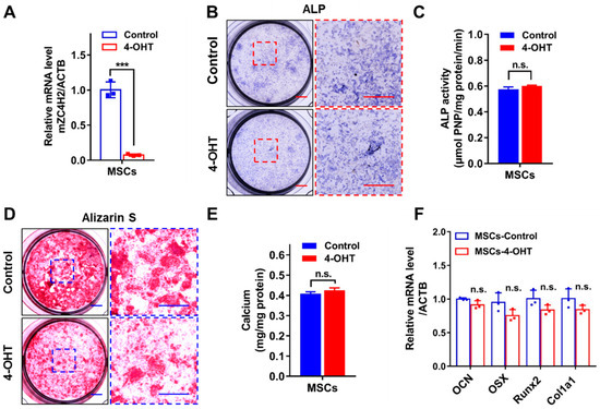 For analysis of the osteoblast differentiated MSCs, after 8 days of induction, ALP staining and quantification were performed using an ALP staining kit (Solarbio, Beijing, China) and an ALP quantification kit (Beyotime, Shanghai, China), respectively. After about three weeks of induction, ARS staining was performed using an ARS staining kit (Solarbio, Beijing, China) and quantified using 10% cetylpyridinium chloride (CPC). The quantified ALP and ARS activities were normalized to protein content.