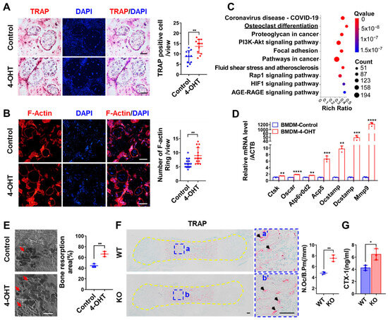 For RNA-Seq analysis of the differentiated BMDM, cells were collected one week after osteoclast differentiation and RNAs were extracted for transcriptome sequencing. The sequencing library was constructed and sequenced by BGI-Genomics on the Illumina platform. First, the sequencing data were filtered with SOAPnuke (v1.5.2) [23]. Subsequently, the clean reads were mapped to the reference genome GRCm38 (https://www.ncbi.nlm.nih.gov/grc/mouse (accessed on 15 August 2023)) using HISAT2 (v2.0.4) [24]. Next, Bowtie2 (v2.2.5) [25] was used to align the clean reads to the reference coding gene set, followed by gene expression level calculation using RSEM (v1.2.12) [26]. Differential expression analysis was performed using DESeq2 (v1.4.5) [27] with a Q value ≤ 0.05 and an absolute fold change ≥ 1.5. Kyoto Encyclopedia of Genes and Genomes (KEGG, https://www.kegg.jp/ (accessed on 15 August 2023)) enrichment analysis of annotated differentially expressed genes was conducted using Phyper (https://en.wikipedia.org/wiki/Hypergeometric_distribution (accessed on 15 August 2023)) based on the Hypergeometric test. The significance levels of terms and pathways were corrected by Q value using a rigorous threshold (Q value ≤ 0.05) according to Bonferroni [28,29].