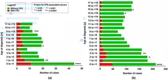 Cancer predisposition syndromes (CPSs) occurred most frequently in infancy, with 22.90% of all children diagnosed with cancer during the first year of life having CPSs (p < 0.0001). This represents more than one-quarter of all CPS cases in our cohort. Within this group, CPSs were most commonly detected in 9-month-olds (41.67% of 12 cases diagnosed with neoplasm at this age, p < 0.001), followed by newborns up to 1 month old (25.00% with p = 0.001) and 5 months old (26.32% of 19 patients at this age, p < 0.05). CPSs continued to be relatively common during toddlerhood, occurring in 15.72% of 3-year-olds (p < 0.01) and 13.74% of 2-year-olds (p < 0.05) diagnosed with cancer. Conversely, CPSs were least likely to be observed in 14- and 15-year-olds, with prevalence rates of 2.17% and 2.44%, respectively, among children diagnosed with any of the previously listed neoplasms at these ages (p < 0.05). In other age groups, CPSs were diagnosed with intermediate frequency, though these results may not be statistically significant (p > 0.05).