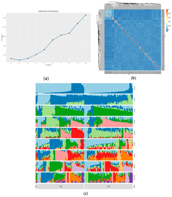 Population structure analysis of white mink. (a) Population structure of white mink with optimal K = 2; (b) kinship heat map; (c) population structure with K from 1 to 10. Each vertical line indicates one individual. Three generations are numbered at the bottom.