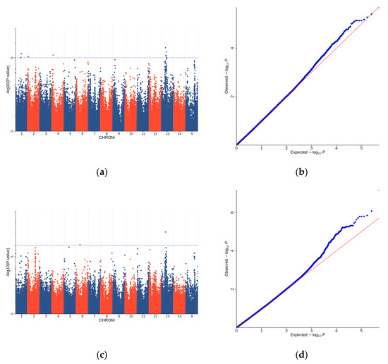The linear mixed-effects model was implemented to conduct correlation analysis using molecular markers and trait phenotypes to identify potential markers or essential genes closely associated with the target traits. The EMMAX software (beta-7 March 2010) was used to depict the results in Manhattan and Q–Q plots [12]. The model was explained in the following manner: Y = Xb + Za + e. The equation includes a vector, b, representing fixed effects like sex, age, gestation duration, and relatedness. The incidence matrices, X and Z, communicate the effects to the outcome variable, Y. The vector labeled e represents the random residuals. Table 1 provides a comprehensive overview of the fixed effects and covariates used in the analyses. Further, the genomic inflation factor (lambda, λ) values are provided to evaluate any potential systematic bias or substructure within the dataset.