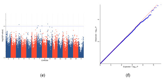 Historical records indicate that the Jinlin white mink was first bred in China. In the 1980s, this species was crossed with the pink-eyed white mink from Denmark and the brown mink from the Soviet Union [13]. Although there has been some recent progress in the ability to reproduce, the characteristics of its fur quality still do not satisfy the market’s requirements. Between 2000 and 2020, Chinese mink farms imported a significant quantity of pink-eyed white, silver-blue, and brown minks from Denmark using over 50 airplanes. Pink-eyed white mink accounted for around 40% of the total number imported [14]. Imported mink have recently acclimated to the harsh weather conditions found in the Liaoning and Shandong provinces and other cold places like the Heilongjiang province. Most of the GWASs using brown mink primarily focused on growth traits, fur quality [7,8], and Aleutian disease [15], while a few investigated reproduction traits. This study was the first to use ddRAD-seq to conduct a GWAS of the BW and reproductive characteristics of pink-eyed white mink in China.