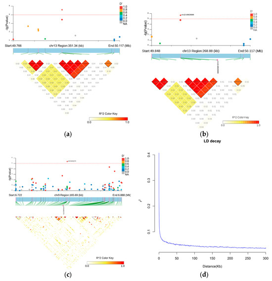 The LDBlockShow software (v-1.40) was used to obtain LD blocks based on the population SNP information. Figure 5 reveals the LD blocks for potential regions on SSC9 and SSC11, as predicted by the LD analysis results. In these regions, 49.766 to 50.117 Mb on SSC13, 49.848 to 50.117 Mb on SSC13, and 6.722 to 6.888 Mb on SSC9, three, one, and three LD blocks were identified. The LD attenuation analysis of the white mink revealed a rapid decline in LD as the distance grew, with an r2 value lowering to 0.1. The average distance between nearby markers was 50 kb (Figure 5d).