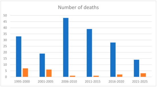 Figure 1 shows mortality divided every 5 years based on the number of deceased patients and the number of patients with new diagnoses in the same period of time. Most deaths in children are concentrated in the decade between 1995–2005 whereas the vast majority of diagnoses were conducted between 2006 and 2016.