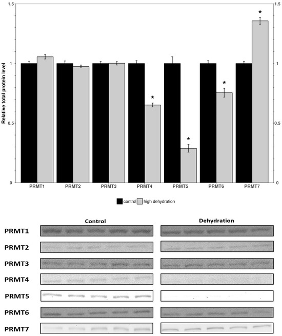 Relative protein levels of PRMTs in the livers of control and dehydrated X. laevis as determined by Western blotting. Corresponding bands from immunoblots are shown below the histogram. Data are mean ± SEM, n = 5 independent trials on samples from different animals. Data were analyzed using a Student’s t-test; asterisks indicate values that are significantly different from the corresponding control (p < 0.05).