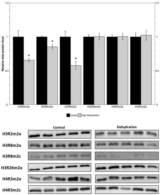 Western blots were performed to determine the relative levels of modified histone residues methylated by PRMTs. The analyzed markers were H3R2m2a, H3R8m2a, H3R8m2s, H3R26m2a, H4R3m2a, and H4R3m2s in the control and dehydrated conditions of the liver and kidney tissues (Figure 3 and Figure 4). In the livers of the dehydrated frogs, H3R2m2a, H3R8m2a, and H3R8m2s, were all found to decrease by 34 ± 11%, 15 ± 4%, and 42 ± 12%, respectively, relative to the controls. In turn, H3R26m2a, H4R3m2a, and H4R3m2s, did not change significantly. In the kidneys of the dehydrated frogs, H3R2m2a, H3R8m2a, H3R8m2s, and H4R3m2a, were all found to increase by 126 ± 12%, 112 ± 7%, 47 ± 13%, and 13 ± 3%, respectively. The other two markers measured in the kidneys, H3R26m2a and H4R3m2s, did not change significantly.