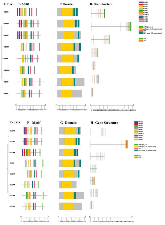 (A) Phylogenetic analysis of buffalo CLCN gene, (B) motif patterns, and (C) conserved domain of the buffalo CLCN genes. (D) Gene structure of buffalo CLCN gene family, (E) phylogenetic relationship of cattle CLCN gene, (F) motif patterns, and (G) conserved domain of the cattle CLCN genes. (H) Gene structure of cattle CLCN gene family.