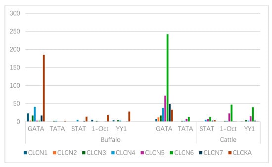 The binding of transcription factors to certain genomic locations is the basis for transcriptional regulation in cells. Based on five transcription positions, the TATA, OCT1, GATA, YY1, and STAT transcription factor binding sites (TFBSs) in the CLCN gene family in cattle and buffalo were examined. The distribution pattern of the TFBSs within the CLCN gene family in buffalo was as follows: GATA > YY1 > OCT1 > STAT > TATA. The pattern seen in cattle was GATA > OCT1 > YY1 > STAT > TATA. All things considered, there were more TFBSs in cattle than in buffalo (Figure 6).