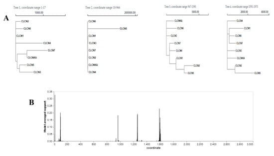 The recombination breakpoints identified by GARD were used to identify fragmented sequences, and the analyses of these sequences showed phylogenetic segregation across several recombination fragment trees: 1-17 (Tree 1), 18-966 (Tree 2), 967-1590 (Tree 3), and 1591-2970 (Tree 4) (Figure 7A). GARD examined 8824 models to identify evidence of recombination breakpoints, and 2965 putative breakpoints were located, with up to 3 inferred breakpoints. Remarkably, the genetic algorithm examined just 0.00% of these (Supplementary Figure S11). By measuring the frequency of detecting a breakpoint at a certain site over all the alignment points using the standardized Akaike weights of the models, the model-averaged support for the breakpoint sites was determined. The best-fitting model and this analysis was consistent. The multiple sequence alignment of eight CLCN gene nucleotide sequences, through multiple breakpoint studies with a genetic algorithm, revealed five main recombination breakpoints, with additional minor breakpoints at various places (Figure 7B).