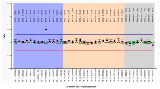 The MLPA results were confirmed using the quantitative PCR (qPCR) technique. The assay was executed using RT2 SybrGreen qPCR Master Mix (Qiagen) and specific primers for EXT1 exons 3, 4, and 5 to obtain a final concentration of 400 nM (primer sequences are reported in Supplementary Materials, Table S1). The ACTB gene was chosen as a reference. Rotor-Gene Q (Qiagen, Hilden, Germany) was used for the thermic protocol. Rotor-Gene Q Series Software (Qiagen; Software Version 2.0.2) was used for the analysis of the results. A Delta Delta CT Relative Quantitation Analysis was applied. qPCR results are expressed using the Relative Concentration (RC) as follow: 0.80 < RC < 1.20 is related to a normal copy number status, 0.40 < RC < 0.65 to the presence of a heterozygous deletion, and 1.30 < RC < 1.65 to a heterozygous duplication.