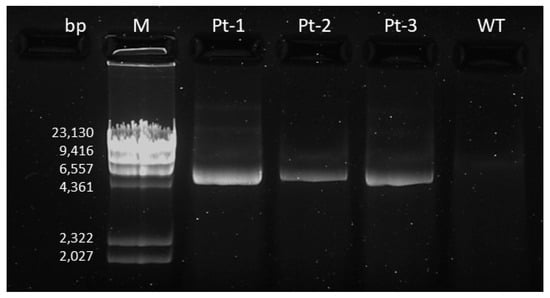Gel electrophoresis results. bp: base pairs, M: molecular weight marker; WT: wild-type sample; Pt: patient.