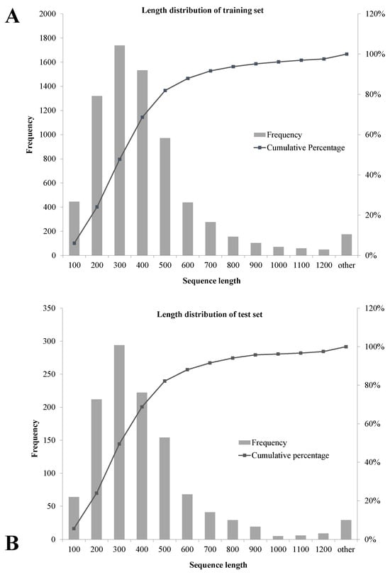 Distribution of sequence length for the training dataset and test dataset. (A) Training set. (B) Test set.
