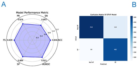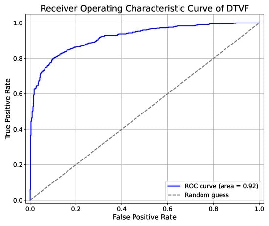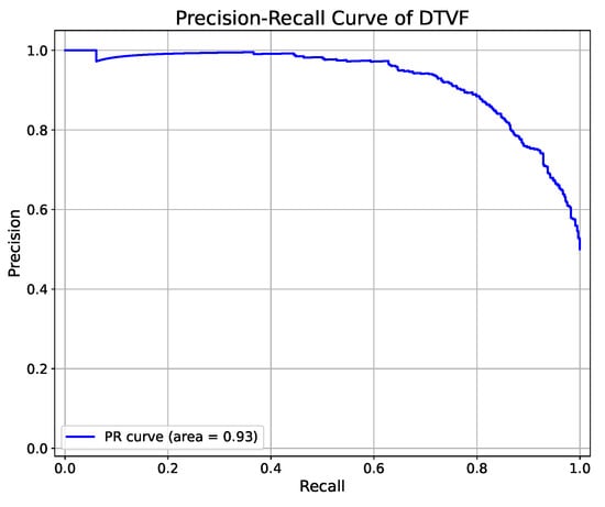 Upon the completion of the training phase, wherein the DTVF model was conditioned using the training set and meticulously selected hyperparameters, the model was subsequently deployed to perform inference on an independent test set. A comparative analysis was conducted, juxtaposing the predictive outcomes with the actual labels. Following this analysis, the performance metrics of the DTVF model were elucidated through the construction of a receiver operating characteristic (ROC) curve, a precision-recall (PR) curve, and a confusion matrix.