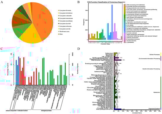 Unigene annotations. (A): Distribution of homologous species based on Nr annotations. (B): Unigene KOG database comparison results. (C): Unigene GO annotation entries. (D): Unigene KEGG annotation category map.