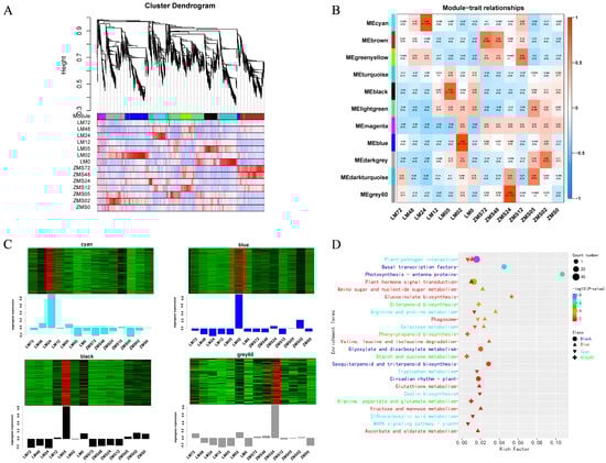 All genes were divided into eleven modules (Figure 4A), and the number of genes within the modules ranged from 47 to 448, with four modules significantly correlating with the traits noted here: the Cyan module correlated with LM24 (R2 = 0.86, p = 1 × 10−4), with 218 genes; the Black module correlated with LM05 (R2 = 0.79, p = 7 × 10−4), with 243 genes; the Blue module correlated with LM02 (R2 = 0.89, p = 2 × 10−5), with 443 genes; and the Grey60 module correlated with ZMS24 (R2 = 0.89, p = 3 × 10−5), with 67 genes (Figure 4B). The heatmap developed based on the log FPKM values reflected the unique expression patterns of the four specific modules corresponding to the time points (Figure 4C).