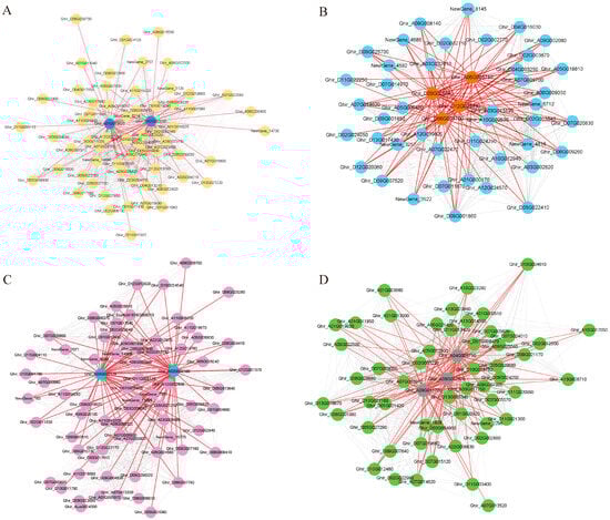 Co-expression network map of genes within the salt tolerance-related module. (A): Black module, blue circles represent hubgene. (B): Blue module, orange circles represent hubgene. (C): Cyan module, blue circles represent hubgene. (D): Grey60 module, grey circles represent hubgene. Each node represents a gene and the lines denote the connections between genes.