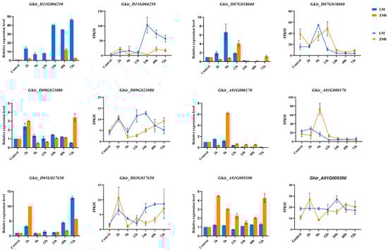 The reliability of the transcript expression profiles obtained via RNA-seq was verified using qRT-PCR. Six DEGs were randomly selected to design specific primers for amplification in 42 samples (Figure 6, Table S8). The QRT-PCR results showed that the expression levels of the selected genes changed significantly under salt stress, and Ghir_D11G004250 was consistently highly expressed in LM at multiple time points. According to the gene annotation results, Ghir_D11G004250 belongs to the bHLH transcription factor family, demonstrating the potential critical role of this gene in salt tolerance. Ghir_A01G000170 and Ghir_D07G018040 were annotated as NAC domain-containing protein 35 and Chlorophyll a-b binding protein 151, respectively, and these two genes were significantly highly expressed within 12 h of stress induction, suggesting a role in the prophylactic response. In addition, the expression patterns of Ghir_D09G023080, Ghir_D03G017650, and Ghir_A01G005300 revealed the association of ETR2, At4g16563, and HBDA with salt tolerance according to the gene annotation results. Overall, the qRT-PCR results were positively correlated with the gene change trends revealed via RNA-seq, which verified the reliability of the RNA-seq data.
