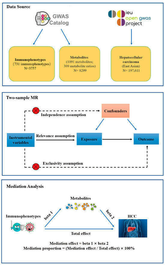 We obtained GWAS data sets that included immunocytes, plasma metabolites, and HCC. Then, two-sample MR analyses were used to evaluate the causal relationship among immunocytes, plasma metabolites, and HCC. Finally, a two-step MR analysis was employed to ascertain the mediation impact of plasma metabolites on the association between immunocytes and HCC. This MR study was carried out in accordance with the STROBE-MR protocol [19].