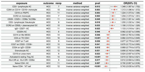 Forest plots depicting the causal impacts of immunocytes on HCC. OR, odds ratio; CI, confidence interval.