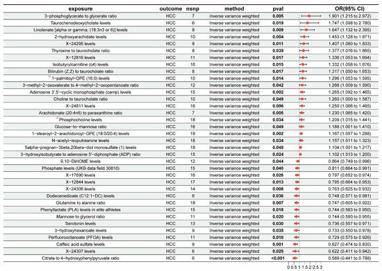 Thirty-six metabolites were linked to changes in the risk of HCC for East Asians (PIVW < 0.05) (Figure 3). Among them, 21 metabolites increased the risk of HCC including the 3-phosphoglycerate-to-glycerate ratio (OR = 1.901, 95% CI [1.215–2.972], p = 0.005) and taurochenodeoxycholate levels (OR = 1.747, 95% CI [1.098–2.780], p = 0.019), while 15 metabolites were linked with the risk of HCC, such as the Citrate-to-4-hydroxyphenylpyruvate ratio (OR = 0.589, 95% CI [0.441–0.788], p < 0.01) and X-24307 levels (OR = 0.622, 95% CI [0.411–0.942], p = 0.025) (Supplementary Table S3). The sensitivity analyses provided evidence that there was no horizontal pleiotropy or heterogeneity in these results (Supplementary Table S4). Moreover, the analysis of metabolic pathways indicated that “glycerophospholipid metabolism”, which includes Phosphocholine and 1-palmitoyl-GPE (16:0), was importantly related to the progression of HCC (p = 0.0099) (Supplementary Table S5).