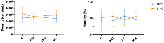 Cell density and viability after 72 h of exposure to 17α-ethynylestradiol (EE2) and levonorgestrel (LNG) at 18 °C and 21 °C. C—control; EE2—10 µM of EE2, LNG—10 µM of LNG, and MIX—10 µM of EE2 + 10 µM of LNG. Data are presented as the mean ± standard deviation. n = 5 independent experiments per temperature.