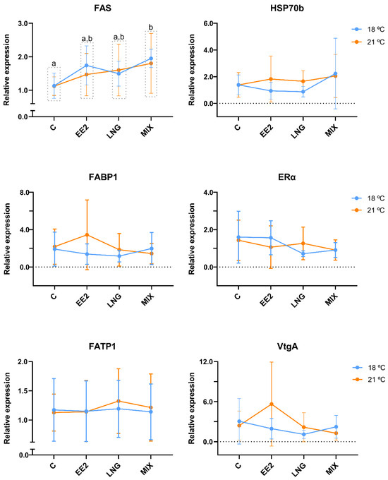 Relative gene expression of targets related to lipid metabolism (FAS, FABP1, FATP1), estrogenic effects (ERα, VtgA), and temperature-related stress (HSP70b) in RTL-W1 cells after 72 h of exposure to 17α-ethynylestradiol (EE2) and levonorgestrel (LNG) at 18 °C and 21 °C. C—control; EE2—10 µM of EE2, LNG—10 µM of LNG, and MIX—10 µM of EE2 + 10 µM of LNG. Data concerning FAS (Fatty Acid Synthase), FABP1 (Fatty Acid Binding Protein 1), FATP1 (Fatty Acid Transport Protein 1), HSP70b (Heat Shock Protein 70 b), ERα (Estrogen Receptor α), and VtgA (Vitellogenin A) relative expression levels are presented as the mean ± standard deviation. Different letters illustrate significant differences between conditions, according to two-way ANOVA followed by Tukey’s test. n = 5 independent experiments per temperature.