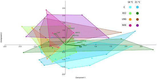 Regarding the PCA results, the scatter plot (Figure 4) aligned with the inferences from the ANOVA. From the plot, there is no substantial clustering of groups given the temperature effect, except for the exposure to LNG, where the 18 °C vs. 21 °C almost clustered entirely. The groups exposed to MIX and LNG tended to broadly overlap, consistent with the fact that most of the significant differences in ANOVA were found under those exposures. Similarly, the groups C and EE2 largely overlapped, with the former being quite distinguishable from the LNG and MIX groups and the EE2 overlapping with all. The PCA identified that the first three components explained 69.5% of the variance (PC1—38.7%, eigenvalue 4.6; PC2—18.5%, eigenvalue 2.2; PC3—12.3%, eigenvalue 1.5, but not relevant according to the broken stick rule). The higher PC1-positive loadings for the variability were due to UGT, CYP1A, FABP1, ERα, and VtgA (all not revealing significant differences in ANOVA). The higher PC2-positive loadings for the variability were due to MRP2, CAT, GST, CYP3A27, FAS, and HSP70b (only the latter did not show differences in ANOVA).
