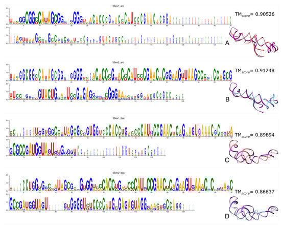 Logo sequences and 3D structures of ExGCs-encoded 5S rRNA. In (A) the Ex1-encoded 5S rRNAs from arc., Ex1-encoded portion (salmon) is superimposed with current 5S rRNA (1ffk purple, TM = 0.90526); in (B) the Ex2-encoded 5S rRNA from arc, Ex2-encoded portion (sky blue) is superimposed with current 5S rRNA (1ffk purple, TM = 0.91248); in (C) the Ex1-encoded 5S rRNA from bac., Ex1-encoded portion (salmon) is superimposed with current 5S rRNA (5gaf purple, TM = 0.89894); in (D) the Ex2-encoded 5S rRNA from bac., Ex2-encoded portion (sky blue) is superimposed with current 5S rRNA (5gaf purple, TM = 0.86637).