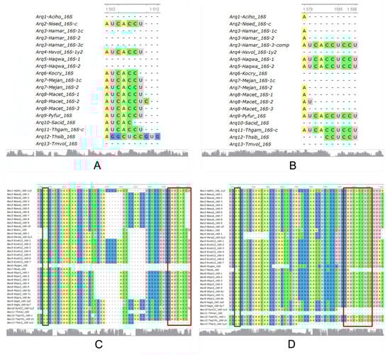 Subalignments (subalns.) extracted from the MSA of the ExGCs-encoded portion of 16S rRNAs anti-SD sequence context and the conservation profiles of the whole MSAs (grey strip below each one). In (A) the subaln. from arc. Ex1-encoded 16S rRNA, in (B) the subaln. from arc. Ex2-encoded 16S rRNA, in (C) the subaln. from bac. Ex1-encoded 16S rRNA, in (D) the subaln. from bac. Ex2-encoded 16S rRNA. In bacterial subalns., the antiSD sequence is marked by a red rectangle and the two essential adenines by a green rectangle.