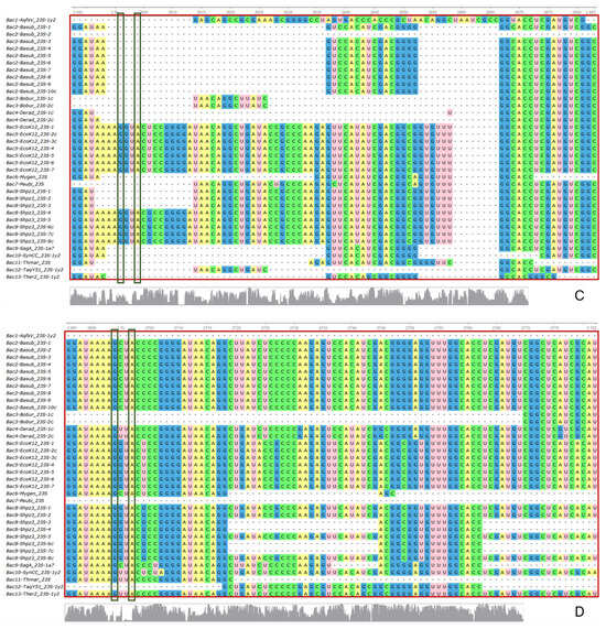 Subalignments (subalns.) extracted from the MSA of the ExGCs-encoded portion of 23S rRNAs PTC and the conservation profiles of the whole MSAs (grey strip below each one). In (A) the subaln. from archaeal Ex1-encoded 23S rRNA, in (B) the subaln. from archaeal Ex2-encoded 23S rRNA, in (C) the subaln. from bacterial Ex1-encoded 23S rRNA, in (D) the subaln. from bacterial Ex2-encoded 23S rRNA. In all subalns., the PTC sequence is marked by a red rectangle, with the two essential nucleotides G2447 and A2451 by green rectangles.