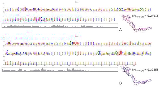 Logo sequences, conservation profiles of the whole MSAs (grey strip below each logo), and 3D structures of ExGCs-encoded 6S rRNAs. In (A) the Ex1-encoded 6S rRNA from bac., Ex1-encoded portion (salmon) is superimposed with current 5S rRNA (4ue4 purple, TM = 0.24615); in (B) the Ex2-encoded 5S rRNA from bac., Ex2-encoded portion (sky blue) is superimposed with current 5S rRNA (4ue4 purple, TM = 0.32555).