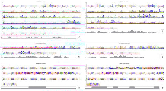Logo sequences from the MSAs of ExGCs-encoded SRP-RNAs and the sequences in the corresponding database [83,84], as well as their conservation profiles (grey strip below each logo). In (A) the Ex1-encoded archaeal SRP-RNAs; in (B) the Ex2-encoded archaeal SRP-RNAs; in (C) the Ex1-encoded small bacterial SRP-RNAs; in (D) the Ex2-encoded small bacterial SRP-RNAs; in (E) the Ex1-encoded large bacterial SRP-RNAs; in (F) the Ex2-encoded large bacterial SRP-RNAs.