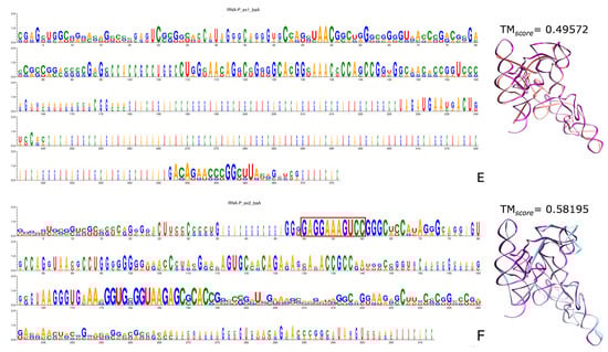 From the alignments of the fragments encoded by each ExGC, we obtained consensus sequences to predict 2D structures (see Supplementary Material S3), which apparently resemble the originals because they mostly exhibit self-complementary base-pairing, excluding only the formation of the main central bulge. Notwithstanding this, the consensuses came from mischievous MSAs, and we failed to obtain a 3D prediction when the corresponding crystallographic templates were used. We skipped the template-based structural reconstruction step; instead, we only aligned the consensus encoded by each ExGC to the experimentally determined structure (PDB ID 4ue4). As can be seen, although all structures and sequences come from 6S RNA molecules, the TMscore indicates rather a random structural similarity (Figure 4A,B).
