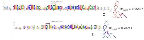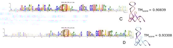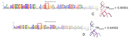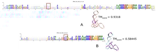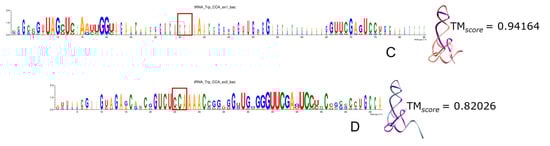 The predicted 3D structures were compared then with the structure of the corresponding current modern molecule, obtained from the repository RCSB-PDB [27,28]. Structural comparisons were performed with the help of the size-independent nt-to-nt alignment web server program named RNA-align [29] from the Zhang Lab suite. This program’s metric, dubbed “TMscoreRNA”, is distance-based with normalised values (0,1], and a match ≥0.45 indicates that both structures are at least in the same Rfam family. Since molecules encoded by ancient genetic codes may be shorter than molecules encoded by the SGC, the TMscore is preferred over the classical RMSD score precisely because the latter considers the length of both sequences, and the results could be overestimated or underestimated.